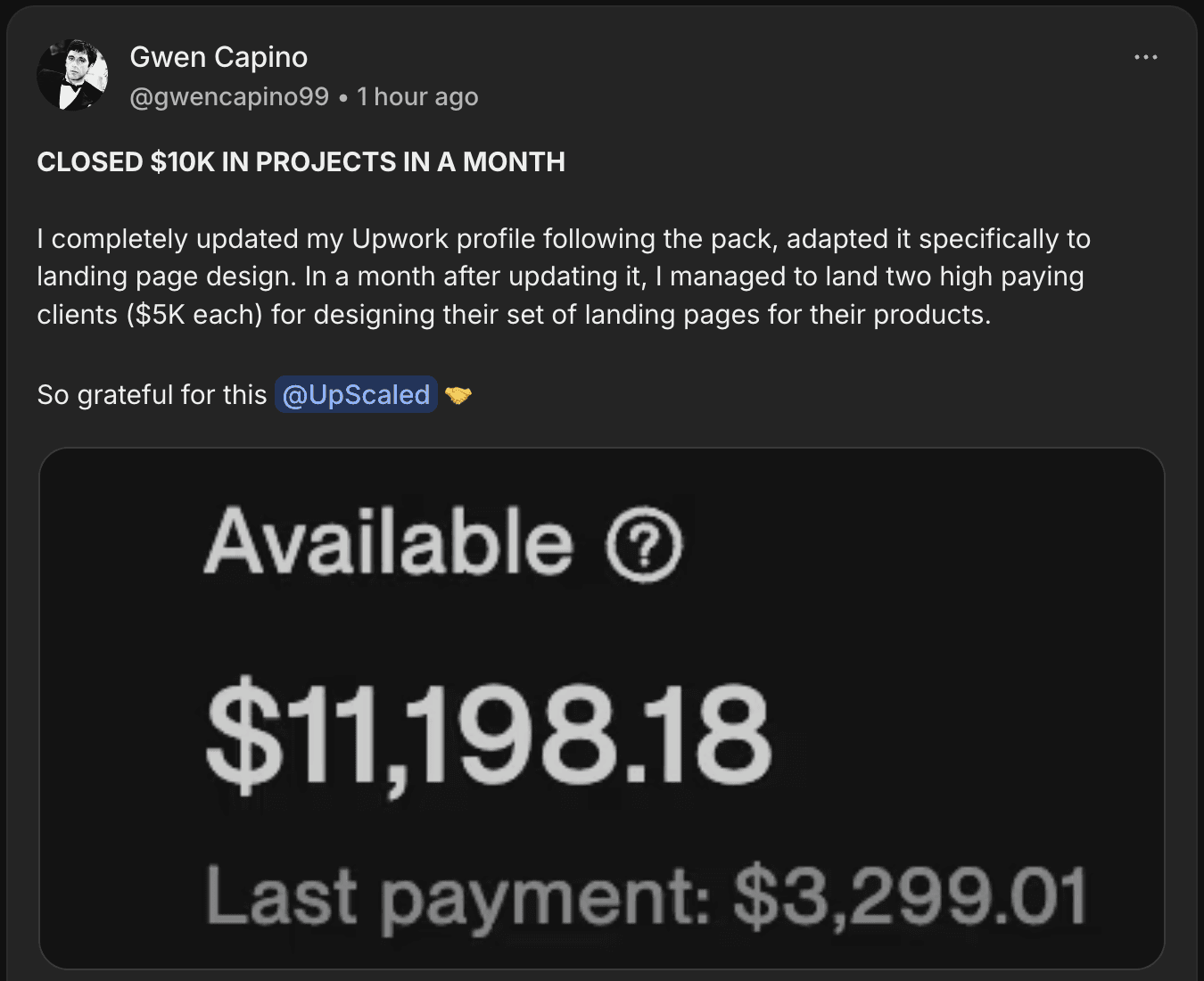“This is the best Upwork product I've ever bought. I updated my Upwork profile using this pack and closed over $10k in projects within a month.”